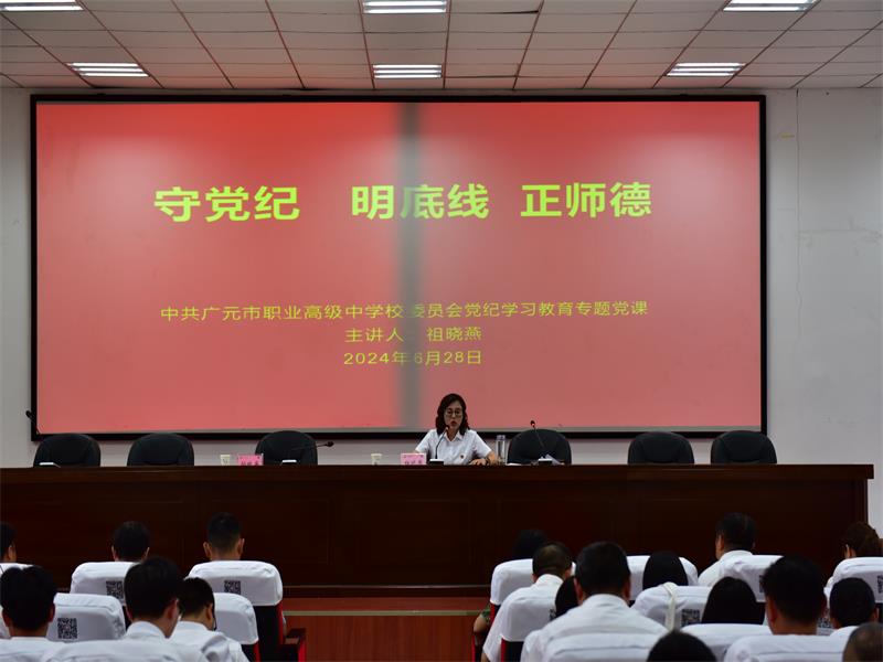 6月28日,广元职高开展党纪学习教育专题党课学习会,学校党委书记祖晓燕以“守党纪 明底线 正师德”为题授课。市委教育工委委员、市教育局党组成员、副局长杨元,市教育局后产科科长孙晓英列席指导。
