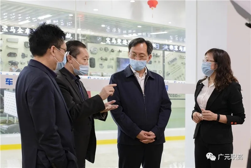 在接受体温检测、登记等流程之后,李江厅长一行进入了校园,观看了广元市职教改革发展宣传展板,实地参观了广元职高白花石刻研发中心、省示范服装专业实训工厂、校办工厂雅致服装有限公司、北方汽修实训室、烹饪专业中餐与西点实训间、以及产教融合实训基地等场所,观摩了省工艺美术大师谢志才、市服装专业名师与技能大师甘小平两位老师的现场教学,关切询问了师生开学复课后的学习生活情况,听取了校长祖晓燕对学校主要工作、办学业绩、 “立德立业”办学理念、 “产教融合”办学模式、 “自主学习”教学模式、 “四自教育”德育模式、 “5+1+1+1”人才培养模式等方面的情况介绍。