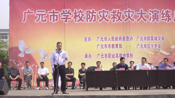 为纪念汶川特大地震4周年和迎接全国第四个“防灾减灾日”(主题是“弘扬防灾减灾文化,提高防灾减灾意识”)及“防震减灾周”(5月7日至13日)的到来。2012年5月8日上午,由广元市人民政府应急办、广元市防震减灾局、广元市教育局、广元市红十字会主办,我校承办的广元市学校防灾救灾大演练启动仪式在我校举行。