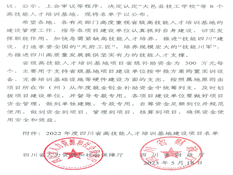 四川省人力资源和社会保障厅和四川省财政厅联合发文《关于公布2023年度四川省高技能人才培训基地建设项目名单的通知》,全省认定了8个高技能人才培训基地,广元市职业高级中学校名列其中。