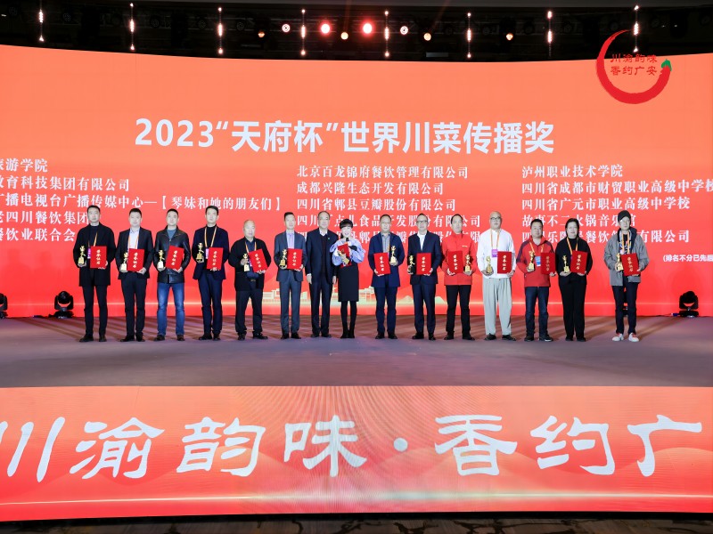 据悉,本次大会于11月15日—17日在四川广安举办,共颁发了“2023‘天府杯’世界川菜传播奖”和“2023‘天府杯’川菜烹饪教育优秀奖”两个奖项。世界中餐业联合会会长邢颖,世界中餐业联合会副会长、国际烹饪教育分会主席卢一,世界中餐业联合会副会长、川菜产业分会主席,眉州东坡董事长王刚以及来自全国200余名国内外烹饪教育院校负责人、全国重点餐饮企业负责人、川渝地区川菜产业优秀企业负责人、广安市当地餐饮企业负责人与会。